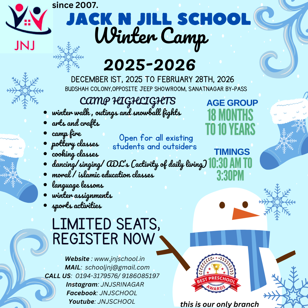 JNJ Preschool (playschool) has an experience of more than 17 years in child care development and preschool education and has succeeded in becoming the number one preschool in valley. More than 10000 parents are satisfied. School started its operations in year 2007 under the banner (Jack N Jill Preschool (play school)) for preschool education. The school started at Parray Pora in a rented building and then was shifted to Baghat in year 2012 and now permanently set up at a prime and safer location at Budshah colony, Sanat Nagar bypass, Srinagar with all the facilities we always wanted to give our students.